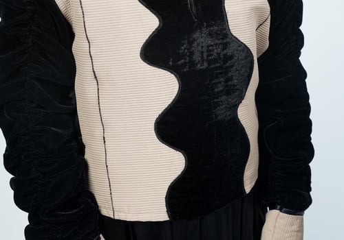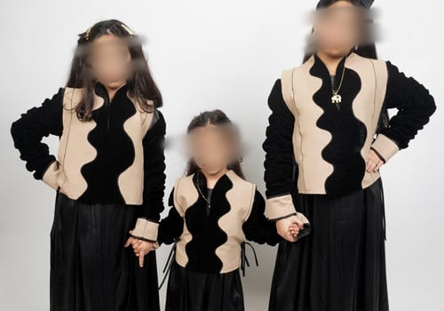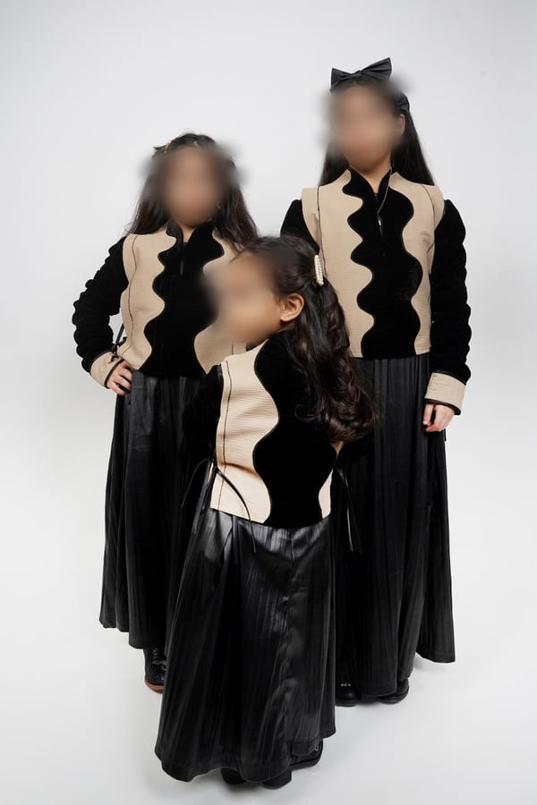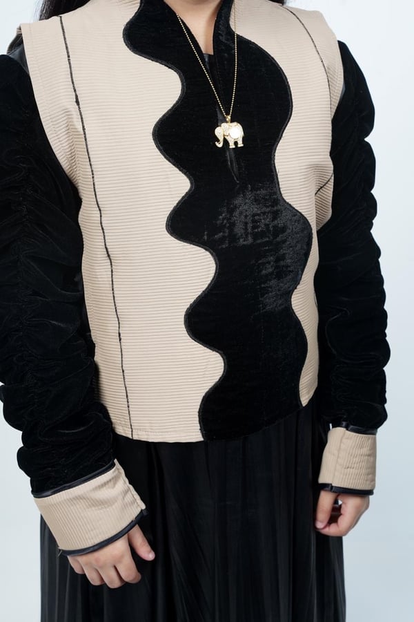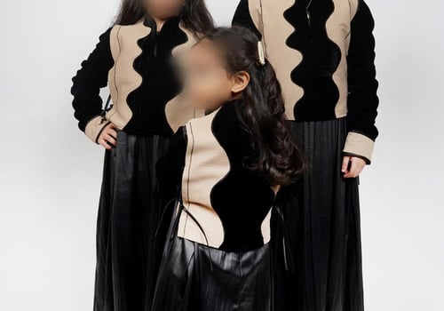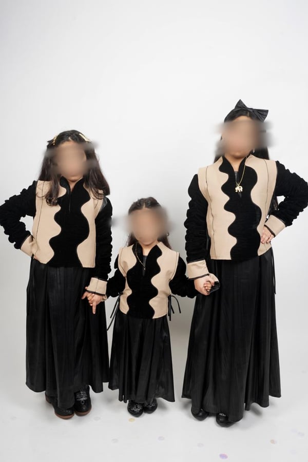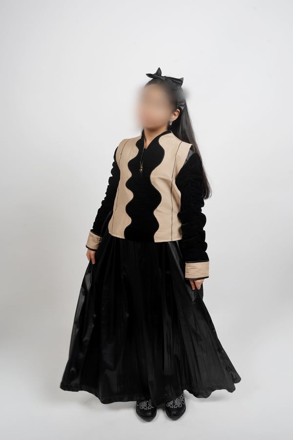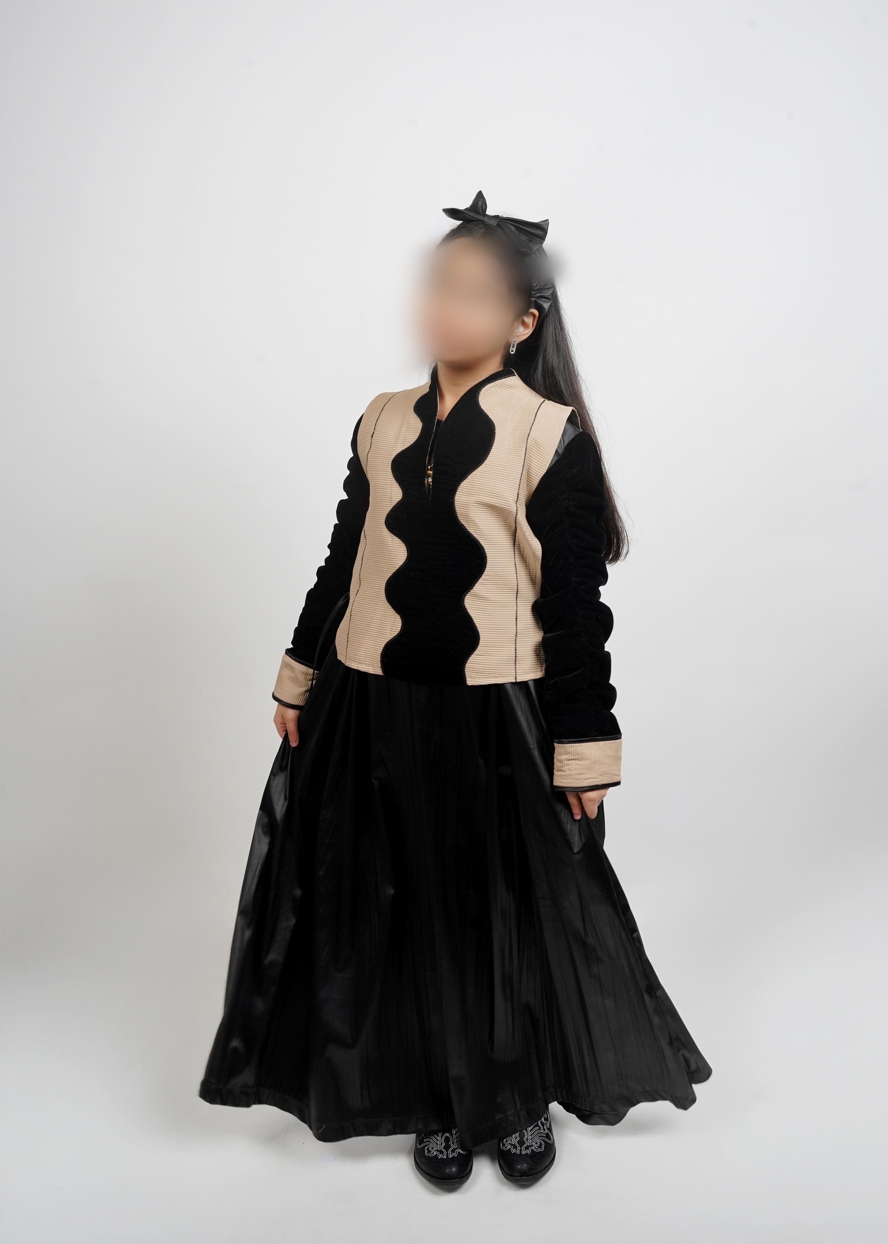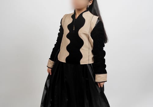 دراعة من الخام الجلد الخفيف والأكمام من المخمل الأسود وقطعة إضافية لها خيوط للربط علئ الأجناب ينصح بالتنظيف عن طريق الدراي كلين فقط